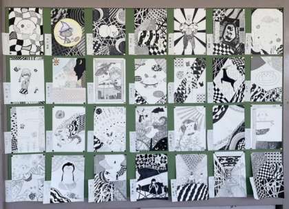 3年生の教室の廊下には、美術で取り組んだ「 パターンアート 」の作品が掲示されています。