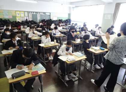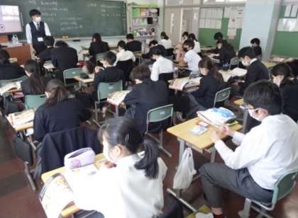 A組は、音楽の授業です。飛鳥中学校の校歌を学習しています。
