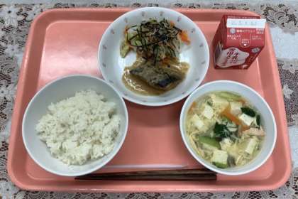 < 今日の献立 > ・ご飯 ・鯖の味噌煮 ・大根サラダ ・かき玉汁 ・牛乳