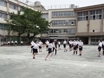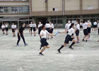 3人1組となり、「 バトンを渡す人 」・「 受け取る人 」・「 その様子を確認し助言する人 」に分かれて取り組んでいます。