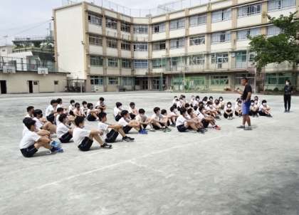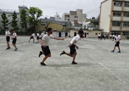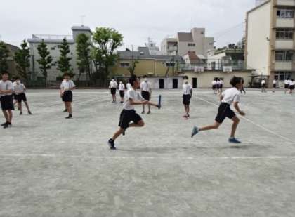 「 リレー 」でのバトンパスに取り組んでいます。