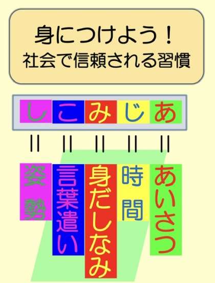 「あじみこし」は、飛鳥中生に身に付けてもらいたい「基本的生活習慣」の土台です。「基本的生活習慣」は、言い換えれば「社会的信頼を得るための最低条件」と言えます。