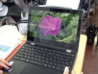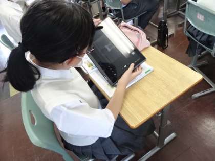その後、生徒たちは、「 Chromebook 」を出し、教科書にあるQRコードを読み込みます。( 写真:上・中 )