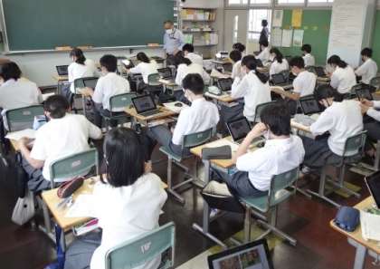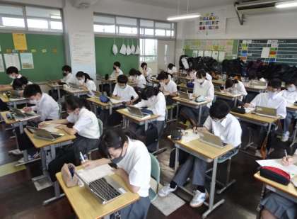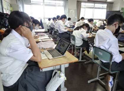 今日の音楽の授業は、音楽室ではなく教室で行われています。