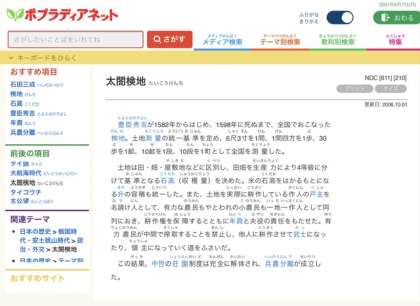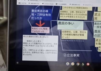 さらに、学習用端末内の「 まなびポケット 」から「 ポプラディアネット = 調べ学習に役立つ百科事典サイト 」を活用し、『 太閤検地 』を検索して、その内容を確認していました。( 写真:下 )