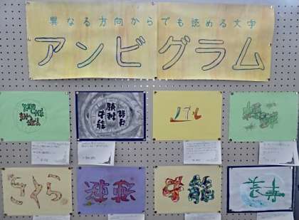 写真は、生徒昇降口に展示されている「 アンビグラム 」の作品です。