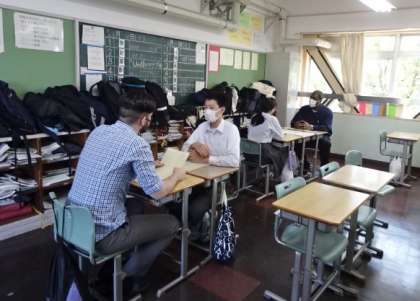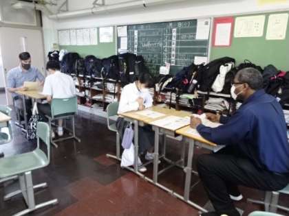 教室の後ろでは、「 英語検定試験での面接試験 」を想定しての練習が行われています。