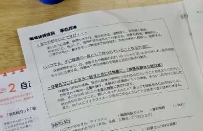 持ち物や服装、職場体験に臨む姿勢などプリントに沿って説明されていました。