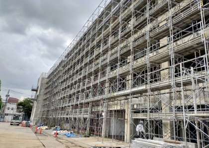 写真は、6月16日(水)の様子です。今週は、再度足場を組み立て、エコウォールの取付作業が始まります。