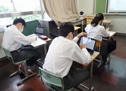 授業では、紙の教科書を利用する生徒、タブレットに答えを記入する生徒とハイブリッド( 複合型 )で授業が進められていました。
