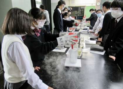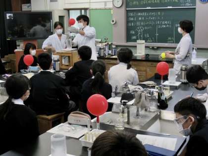担当の先生のほか、お茶の水女子大からの先生と理科支援員の先生が加わり、実験が進められています。(写真:上、白衣を着用した方々)さらに、担任の先生も授業の様子を参観されていました。