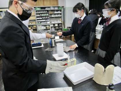 実験の際の注意事項、換気・安全眼鏡(ゴーグル)の着用・起立して実験などをしっかり守り、進めていました。