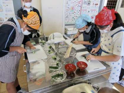 家庭科室では、「 きゅうりの薄切り 」のテストが行われています。