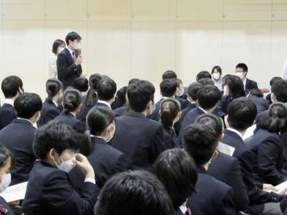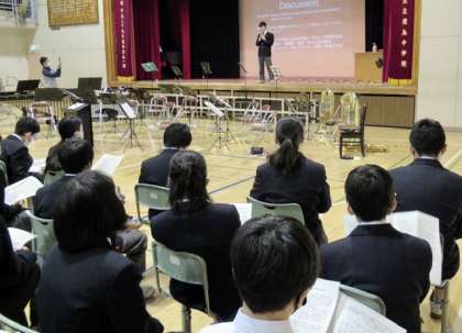 英語でのスピーチを聞いて( 日本語訳を配布 )、その問いに自分の考え、意見を( 日本語で )述べ議論しています。( 写真:中 )