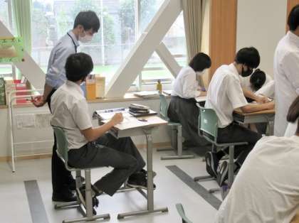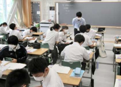 その後、周りの人と確認していましたが、ご覧のとおりTTで授業を進めているので、生徒たちは、いろいろと質問をしていました。(3年生は昨年も院生との授業を行っています)