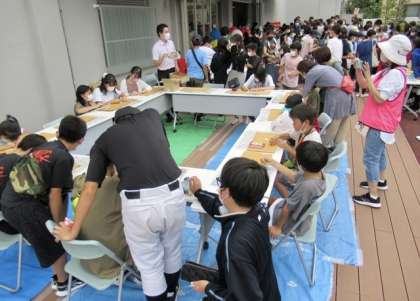 写真:下、飛鳥中学校おやじの会の皆様による『 かたぬき 』は、中学生も真剣です。