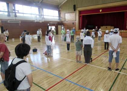 はじめに体育館で開会式があり、自治会長様から避難所となる飛鳥中学校の避難所としての設備や機能等について説明がありました。