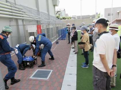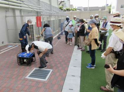 消防の方たちによる「 発電機 」の使い方のデモンストレーションのあと、参加されている方たちも実際に体験していました。