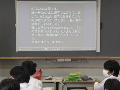 道徳の授業の導入として、スクリーンには、学校生活で起きそうな事例が提示されています。