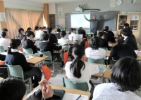 続いて、郷田先生が「 なぜ1年生の学年種目を大縄にしたか 」などの話を熱く語ってくれました。生徒は真剣なまなざしで聞いていました。