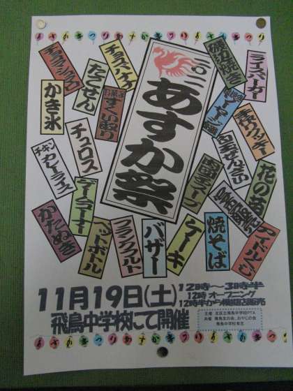 あすか祭 11月19日(土)です! ポスターできました! 公開日 2011/11/07 更新日 2011/11/07 学習・学力向上 あすか祭 11月19日(土)です! ポスターできました! PTAの方が、素敵なポスターを創作されました。 今、即売会の寄付を募っています。 どうぞよろしくお願いいたします。 売上の一部を、東日本大震災の援助にも活用する予定です。