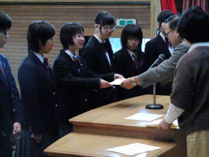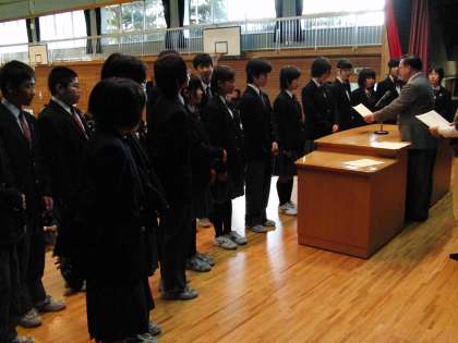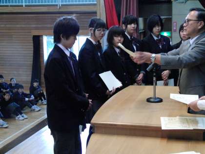 11月7日(月) 朝礼で、学芸発表会合唱コンクールの指揮者と伴走者、ポスター賞を表彰!素晴らしいリードでした!