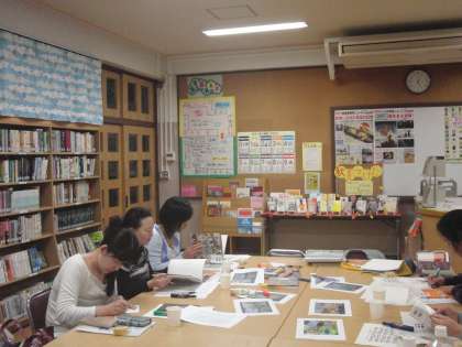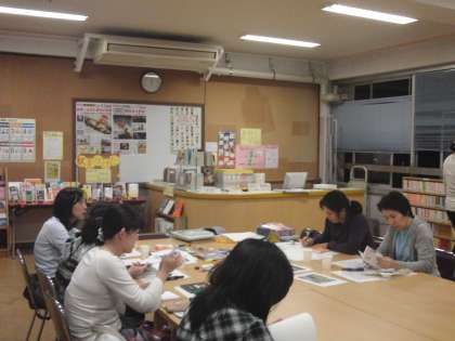 新しい本がたくさん入った飛鳥中学校の学校図書館で、今日は、図書ボラティアのお母さんたちが本の紹介のためのポップ作りをしてくださいました。
