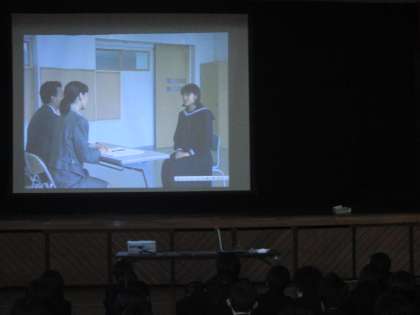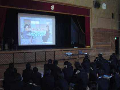 今日は、3年生全員で、面接練習の方法をビデオを見て学習。