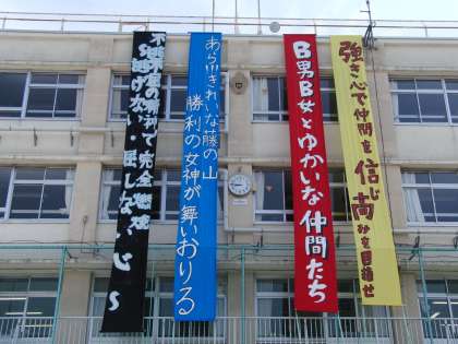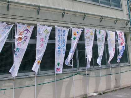 ※正門入口には、生徒会が中心になって呼びかけた東日本被災地の宮城県岩沼市立玉浦中学校への応援メッセージが、全学級数9本の幟旗(のぼりはた)になって風になびいていました。呼びかけの心は「私たち飛鳥中生徒は決して玉浦中を忘れない」とのことです。