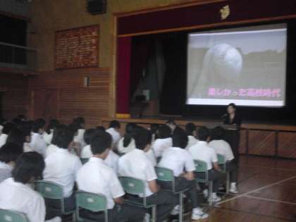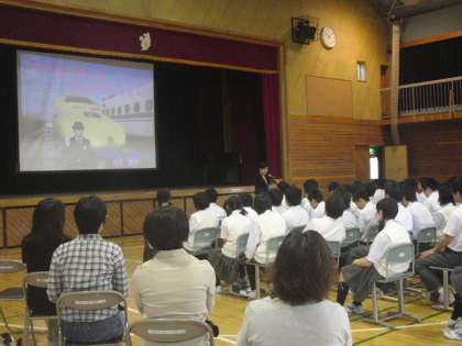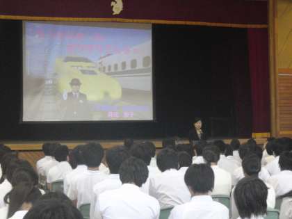 ※新幹線初の女性運転手(JR西日本東京指令所)の方をお招きして、自分の進路や職業、生き方等のお話を聞きました。生徒は真剣に聞いていました。