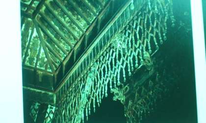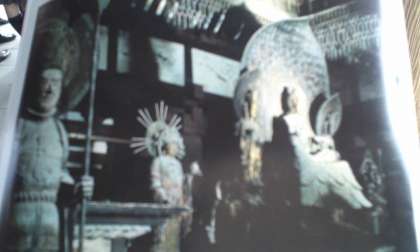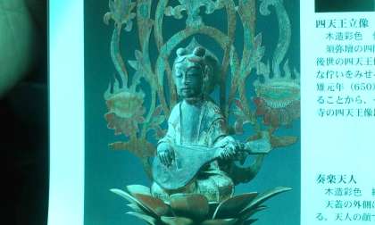 金堂の上のてんがいという飾りに、奏楽天人と飛鳥中学校の校章のデザインのもとの鳳凰があります。宝物館に本物がありますが、金堂ではうまく見えないようです。