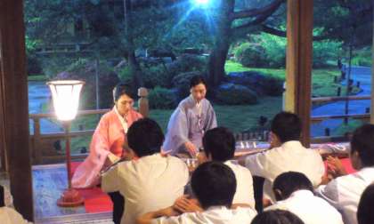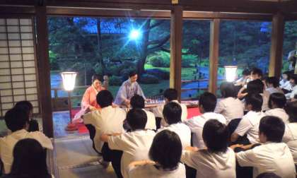 抹茶と和菓子のいただき方、説法、そしてお琴の演奏。演奏は小雨の中で幻想的でした。