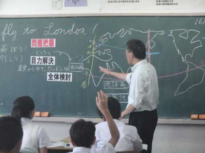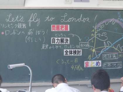 1年生社会科、ロンドンオリンピックに日本からロンドンに飛ぶ。どのような方位に行くのかを考えながら、多様な目的に応じた地図を学んでいくという発見的な学習。