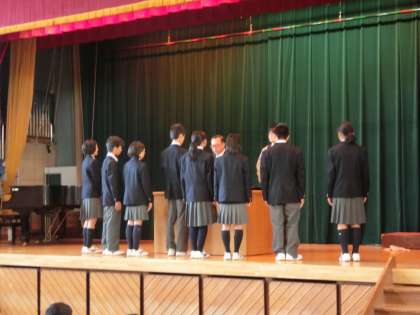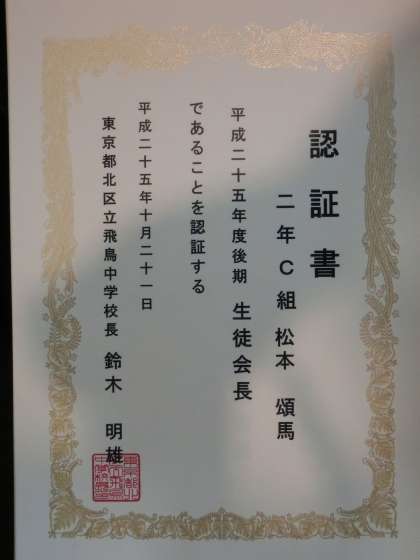 10月21日(月)生徒会&各委員会 生徒会役員&委員長&委員の認証式 公開日 2013/10/23 更新日 2013/10/23 部活動・生徒会 10月21日(月)生徒会&各委員会 生徒会役員&委員長&委員の認証式 新しい生徒会、委員会になり、新委員長・委員が選出されました。 委員長は、ダークブルーの胸章、各委員は委員会カラーの胸章をつけます。 誇りと意欲で、新しい飛鳥中学校を創り上げてください。