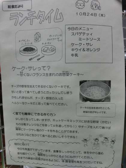 ケークサレとは、甘くないフランス生まれのお惣菜(そうざい)ケーキのことだそうです。味わい深いものでした!スパゲッティーミートソースも美味しい!生徒の皆さん、明日の学芸発表会に向けて、よく食べています!?