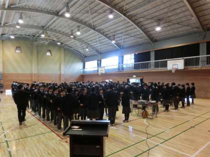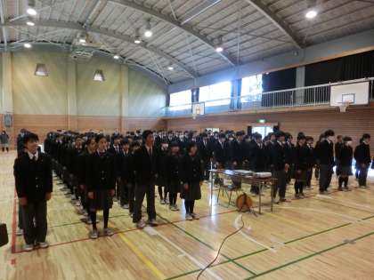 3年生が卒業し、1回だけ、1&2学年だけの朝礼です。皆さん、立派な態度でした!