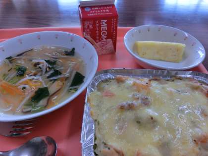 グラタンや揚(あ)げパンなど豊富で美味しいメニューです。スパゲッティミートソースの量はびっくりですね。