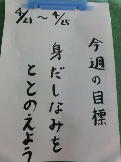 今週の生活目標 公開日 2014/04/22 更新日 2014/04/22 学校生活 今週の生活目標 ※身だしなみは、自分の問題です。自分を他の人にどう見ていただくか、というマナーの問題でもあります。清潔できちんとした姿をした人は素敵に見えるものです。中学生として大人の一歩として考えてみましょう!