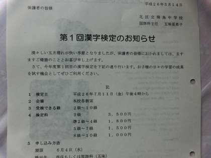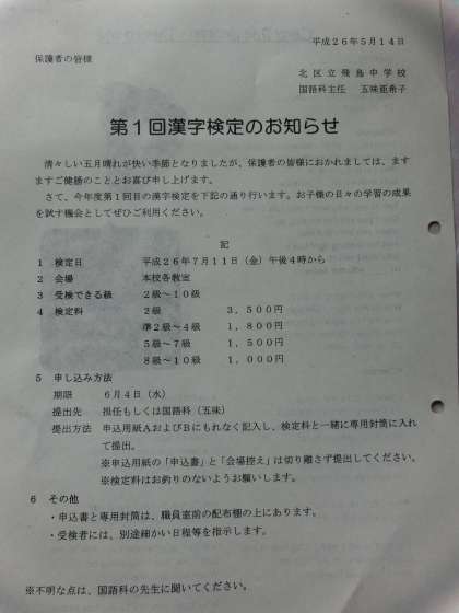 漢字検定にチャレンジしよう!生涯学習資格になります! 公開日 2014/05/19 更新日 2014/05/19 お知らせ 漢字検定にチャレンジしよう!生涯学習資格になります! テキストなど国語科の先生に相談しましょう。自分でコツコツと社会人上級レベルまで取得した生徒もいます。 ※飛鳥中学校を卒業するまでに、英語検定・漢字検定・数学検定の資格を取得するという目標を掲げています。ぜひチャレンジしてみましょう。会場は学校です。〆切6月4日(水)です!