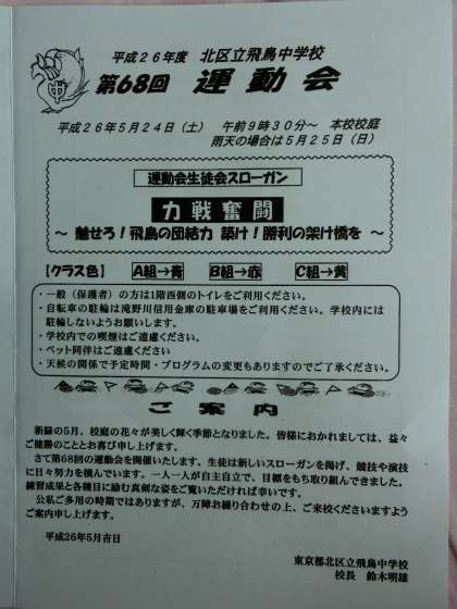 5月24日(土)は飛鳥中学校の運動会です!★開催等の連絡は朝7時、ホームページと配信メールで行います!気合の入った練習が続いていますので、どうぞ奮ってご参集ください。 (東京都北区立飛鳥中学校長 鈴木明雄)