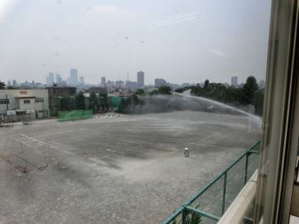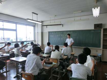 ※暑い校庭には、スプリンクラーで水がまかれています。しかし、試運転中のエアコンで教室環境はよく、涼しい中で生徒の皆さんは頑張っています。