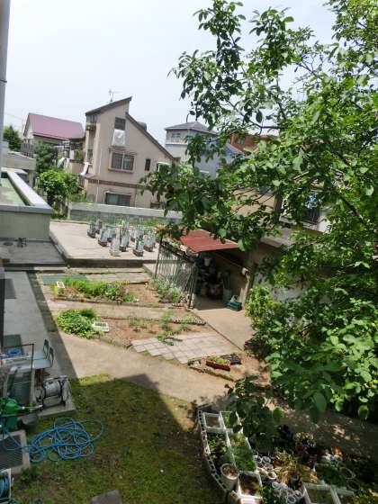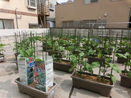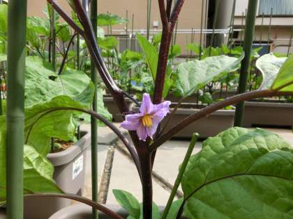 ※3学年:技術科の茄子の栽培で、美しいうす紫色の花が咲き出しています。お時間あれば、中庭をご覧ください。本校の中庭は、トトロも出そうな山里風です。胡桃(くるみ)の実がとても大きくなりました。