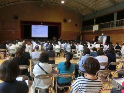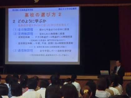 ※本校と中高連携校の都立芝商業高校の校長丸山先生に、都立高校全般のお話をしていただきました。丸山校長は東京都教育委員会高校支援部課長でおられたので、大変分かりやすく新しい高校の内容を説明いただきました。やはり、進路は自分で決める!そのため、自分でいろいろな高校を見て歩くとよいと言われていました。誠にありがとうございました。また、3学年だけでなく、1・2年生の保護者の方々も30名以上が出席されました。少しでも最新情報を得たいというお気持ちと思います。ありがとうございました。