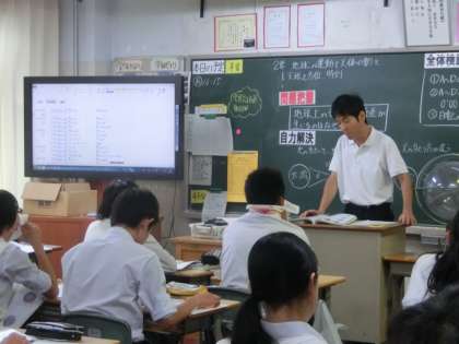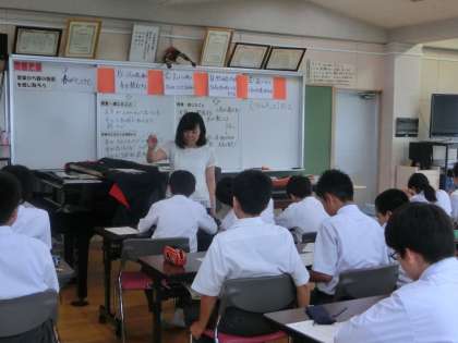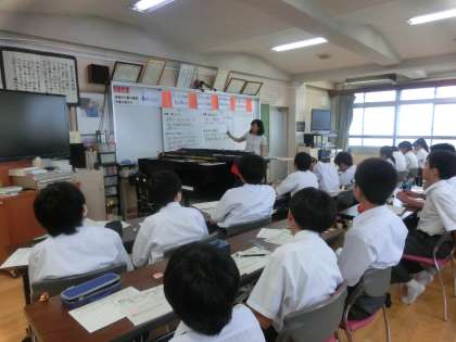 数学・英語は少人数授業、国語、理科、音楽、美術、家庭科と実施。今年のポイントである自己評価を一人一人の生徒がしっかり取り組んでいたこと、そして先生方の授業が主体的に考える工夫だけでなく、楽しく、魅力的であることが印象的です。発言の生徒も多くなったようです。