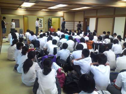 7月10日(木) 修学旅行第3日目 公開日 2014/07/10 更新日 2014/07/10 学校生活 7月10日(木) 閉館式。名残惜しいですが、支配人様に御礼の挨拶、また御礼と無事の旅を励まされました。