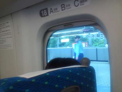 新幹線のぞみ、今、新横浜駅に停車。予定通りです。