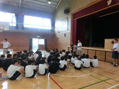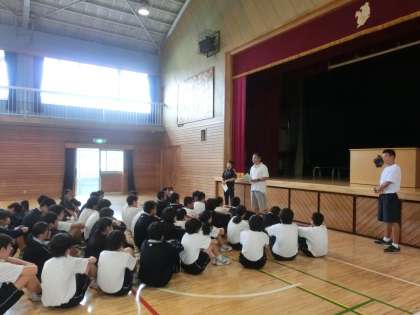 7月18日(金)夏休み前の集会 きちんとした態度です。大掃除のためジャージ姿です!有意義な夏休みを期待します。
