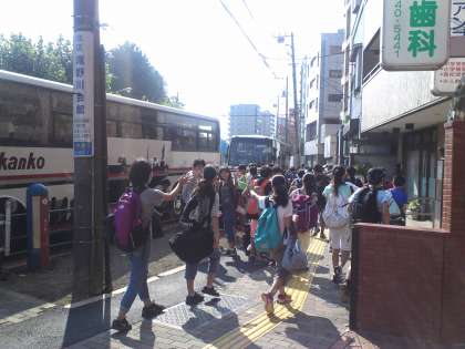 待ちに待った千葉県の岩井海岸へ出発です。岩井海岸は遠浅の日本有数の海水浴場です。生徒の皆さん、元気です。