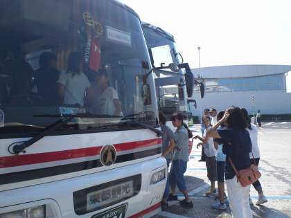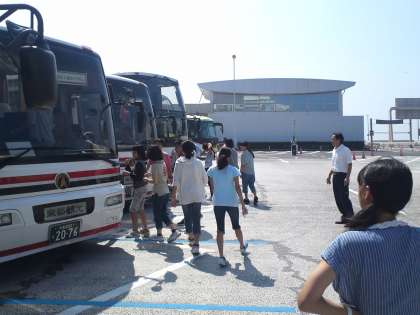 東京湾アクアライン、海ほたるパーキングエリアでトイレ休憩。ちなみに、このアクアラインは1997年開通で、中学校1年生はそのあと3年後の生まれですね。また今、大型バス通過料金は1万円でした。現在、2,500円。ゆっくり海風にあたるという時間はなく、一路、岩井海岸へ向かいます。