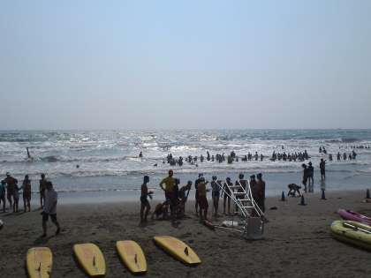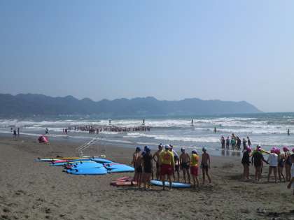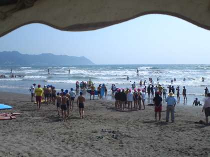 ライフセービングいよいよ、グループごとに目標を定めて、泳いだり、技術を磨いたりします。
